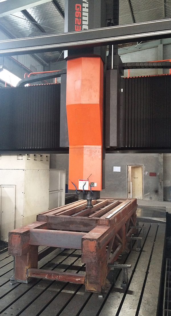 ◆橫梁采用厚壁10*200*300大方管,經(jīng)時效升溫580度自然降溫去應(yīng)力,采用五面加工中心一次成型加工,保證導軌面齒條面,立柱安裝面的形位公差,然后用側(cè)銑頭打孔攻絲一次合成,從而保證裝配精度。